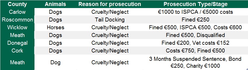 The majority of prosecutions relate to cruelty and neglect of dogs, while there is one case which relates to the cruelty and neglect of horses.